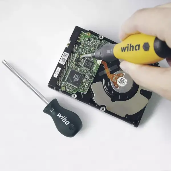 Torque screwdriver TorqueVario-S, safely anti-electrostatic energy protection includes a bit holder 1/4 inch bits and also compatible with 4 mm Wiha Torque interchangeable blades, range 0.5 – 2.0 Nm with tolerance 6% ESD
