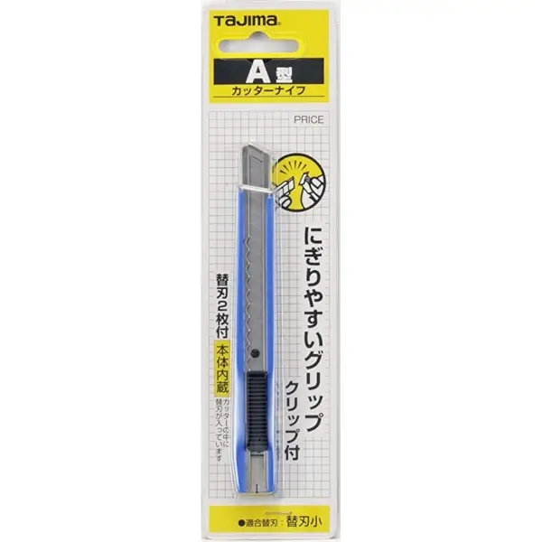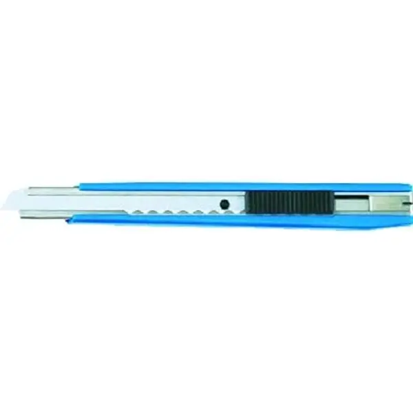 Universal cutter with slide blade lock mechanisms, made of stainless steel covered with blue slim plastic handle tough and light-weight equipped with 3 of 9 mm-blades