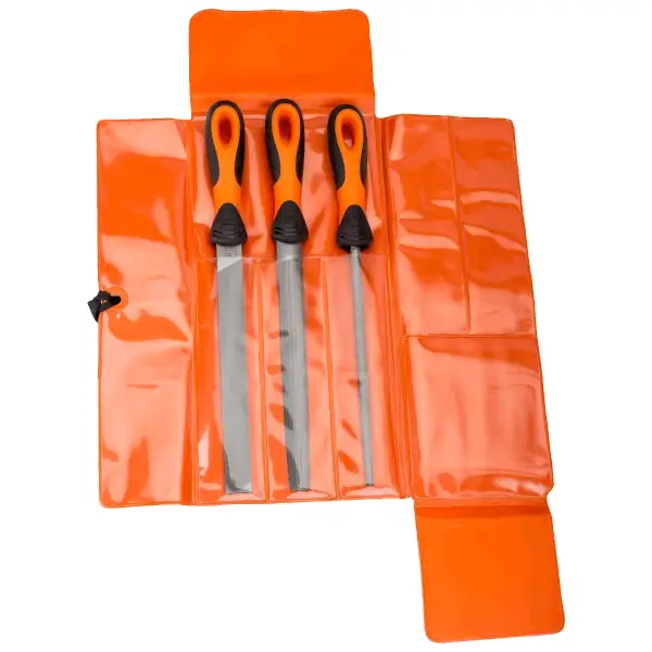 Set of engineering files (Second Cut) for multi applications usage also easily carrying, contains Flat, Round and Half-Round file length 200 mm with Ergo comfortable handle, in plastic roll-up wallet