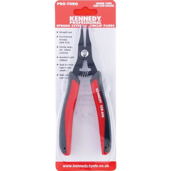 Pro-Torq sprung external straight jaw circlip pliers made of specially selected steels. with dual-material grip handles and coil-sprung PVC cushion grips, overall length 150 mm and the capacity is 10–25 mm