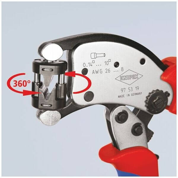 Twistor T Self-Adjusting crimping pliers for extra-long wire ferrules up to 18 mm length with 360 degree rotatable die head Trapezial crimp profile from 0.14 – 10 sq.mm
