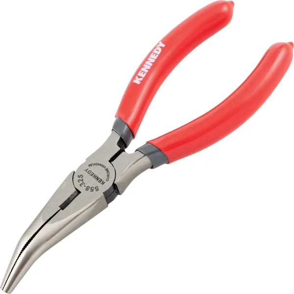 Bent snipe-nose pliers are made from chrome vanadium steel and have a bonded vinyl-coated handle to improve user comfort, grip and control with have a serrated jaws, jaws 50 mm long overall length 160 mm