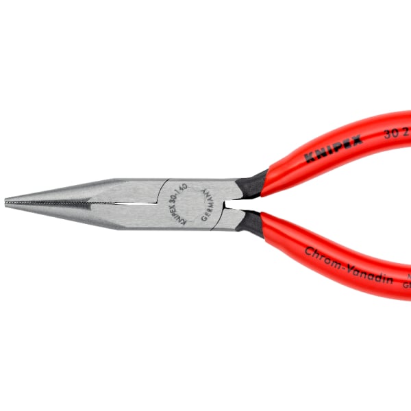 Long reach needle nose pliers with half-round jaws plastic coated handles length 200 mm