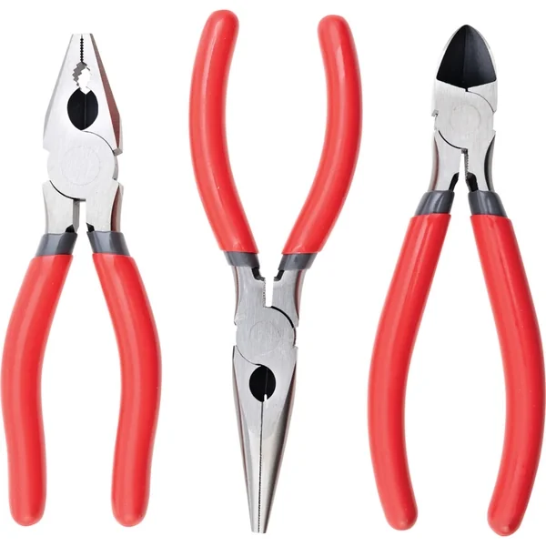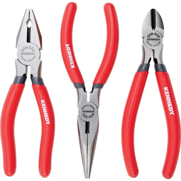Universal 3-piece set of plier and cutter is ideal for maintenance and repair, includes an snipe nose (160 mm), diagonal cutters (160 mm) and combination pliers (160 mm), all of which are made of chrome vanadium steel.
