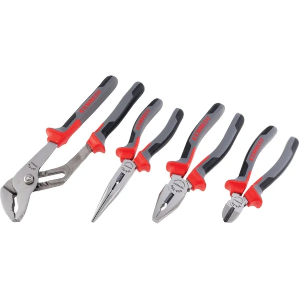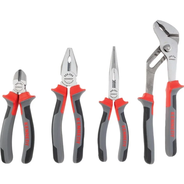Pro-Torq pliers set 4 pieces features dual-material handles to prevent slippage. The set includes combination, diagonal cutter, groove joint and snipe nose pliers, pliers are made of chrome vanadium steel with induction-hardened cutting edges