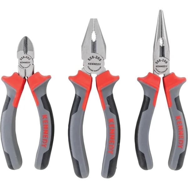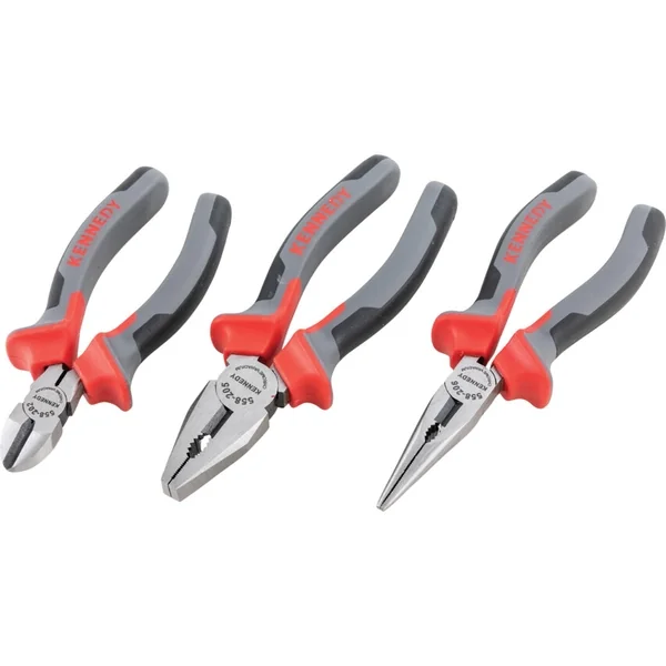 Combination pliers, snipe nose side cutting pliers and diagonal cutter with multi-component grips 3 pieces in plastic tray