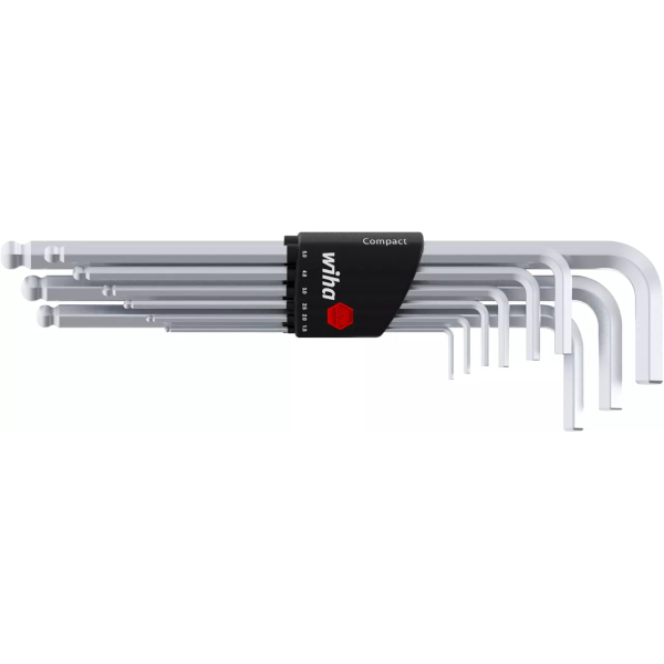 Set of hexagon L-wrench ball end made of chrome-vanadium steel chrome-plated through-hardened 9 pieces size 1.5-10 mm in Compact holder in retail packaging