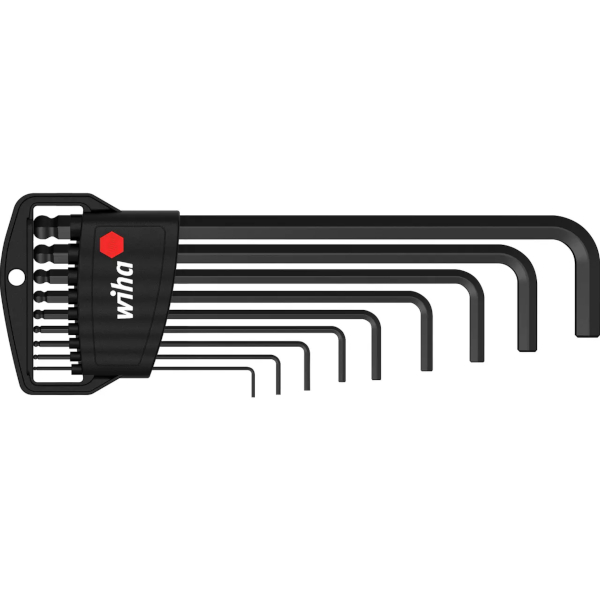 Long hexagon L-wrench with ball ended and short neck for work in restricted the height made of structural steel hard chrome plating 9 pieces in plastic holder size 1.5-10 mm