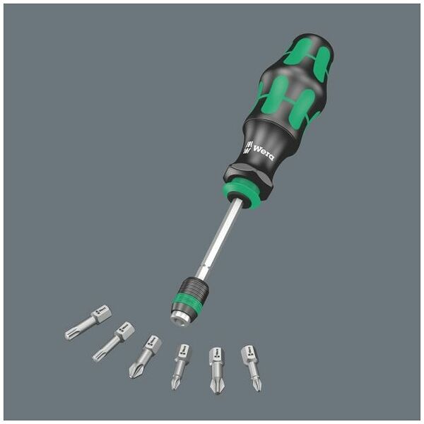 T-handle bitholding screwdriver integrated reversible ratchet with rotating sleeve for extremely high working speed Rapidaptor chuck 1/4 inch (C6.3 and E6.3) for fast bit changes blade length 45 mm