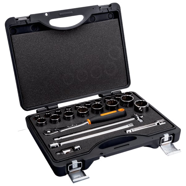 Bi-hexagon socket 1/2 inch square drive chrome-plated polished with 12-points traction profile size 10-32 mm with extension bars, universal joint and reversible ratchet 25 pieces on soft foam insert Safety-Insert-System (SIS) in Plastic box