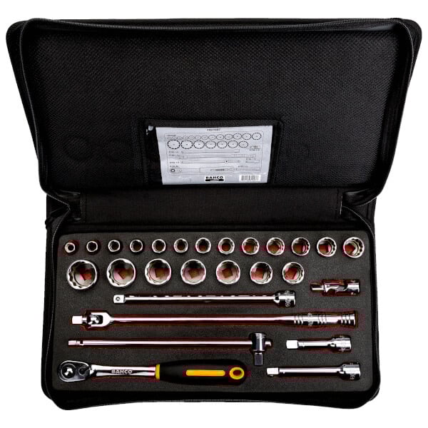 Bi-hexagon socket 1/2 inch square drive chrome-plated polished with 12-points traction profile size 10-32 mm with extension bars, universal joint and reversible ratchet 25 pieces on soft foam insert Safety-Insert-System (SIS) in Plastic box
