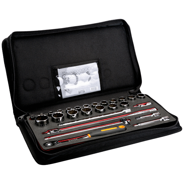 Socket set 1/2 inch square drive with metric bi-hexagon socket size 10-32 mm, slim head reversible ratchet and extension bars included 27 pieces in polyester textile case