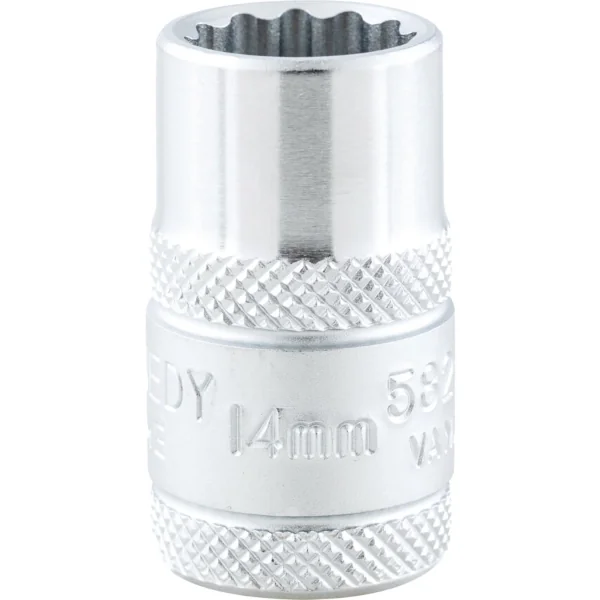 Bi-hexagonal socket with a 1/2-inch square drive with long-lasting reliability, mirror finish for easier cleaning, with side drive design for superior grip and torque, overall length 37 mm size 14 mm