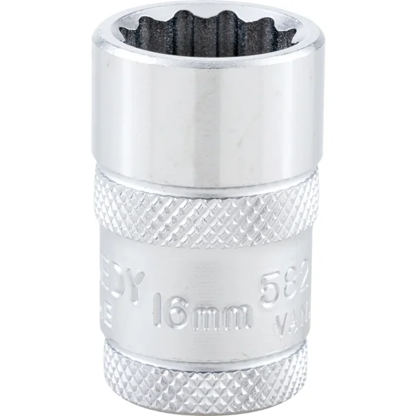Bi-hexagonal socket with a 1/2-inch square drive with long-lasting reliability, mirror finish for easier cleaning, with side drive design for superior grip and torque, overall length 37 mm size 16 mm