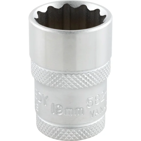 Bi-hexagonal socket with a 1/2-inch square drive with long-lasting reliability, mirror finish for easier cleaning, with side drive design for superior grip and torque, overall length 37 mm size 19 mm