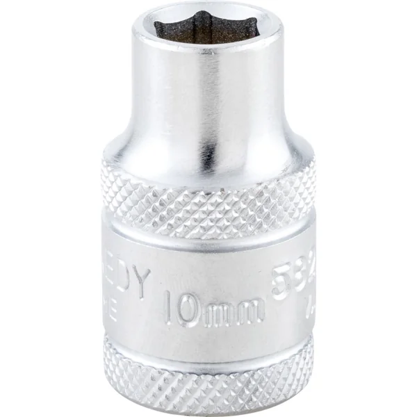 Hexagon socket with 1/2-inch square drive, chrome vanadium steel with polished finish, offers more positive location on worn or rounded nuts, overall length 37 mm size 10 mm