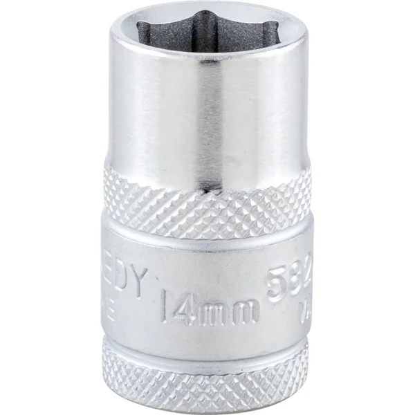 Hexagon socket with 1/2-inch square drive, chrome vanadium steel with polished finish, offers more positive location on worn or rounded nuts, overall length 37 mm size 14 mm