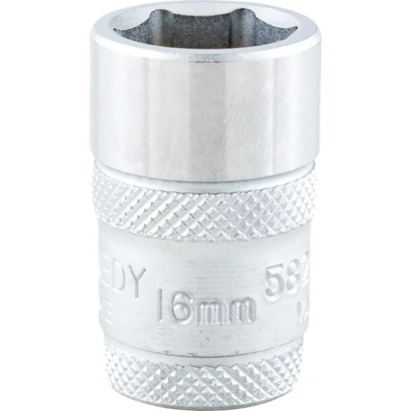 Hexagon socket with 1/2-inch square drive, chrome vanadium steel with polished finish, offers more positive location on worn or rounded nuts, overall length 37 mm size 16 mm