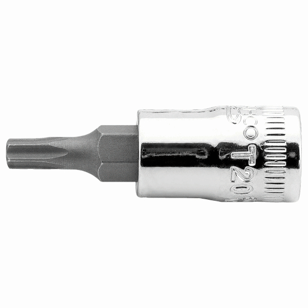 Hexagon socket 1/4 inch square drive size 5-14 mm, Torx socket size E5-E10 and bit socket size H3-H6, SL1, PH2, T10-T30 with extension bars, spinner and reversible ratchet 33 pieces on soft foam insert Safety-Insert-System (SIS) in Plastic box