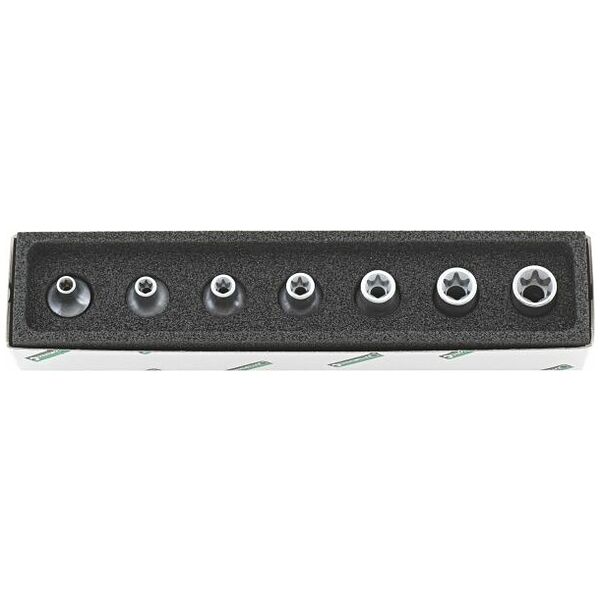 Set of Torx socket 3/8 inch for external Torx screws made of HPQ high performance steel length 28 mm 7 pieces size E5 – E14 in foam inlay with cardboard packaging