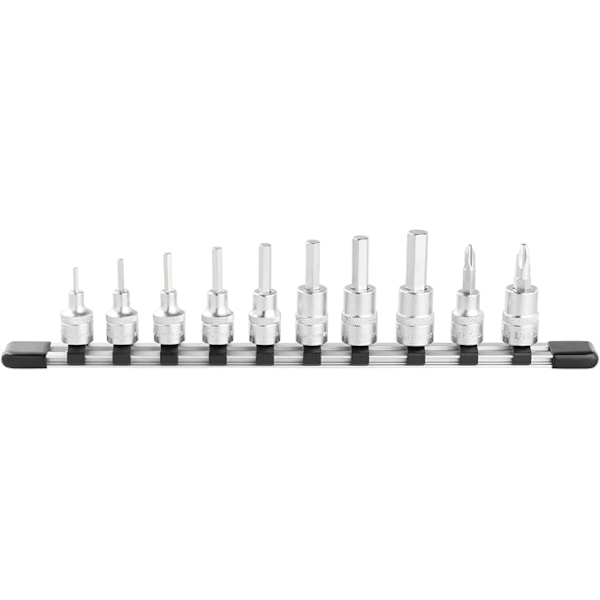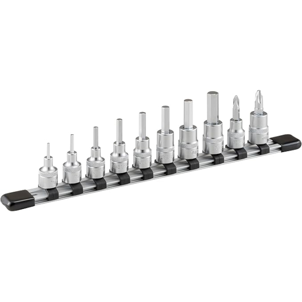 Hexagon bit socket 3/8 inch made of structural steel chrome plated 8 pieces size 2.5-10 mm and phillips bit socket size PH2-PH3 with socket rail