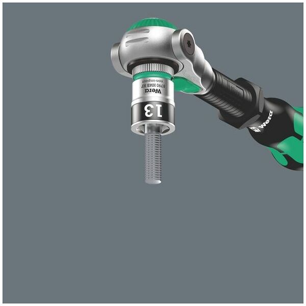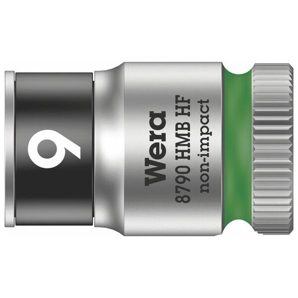 Hexagon socket 3/8 inch with holding function and colour coding by size made of matt chrome chrome-vanadium length 29 mm size 9 mm