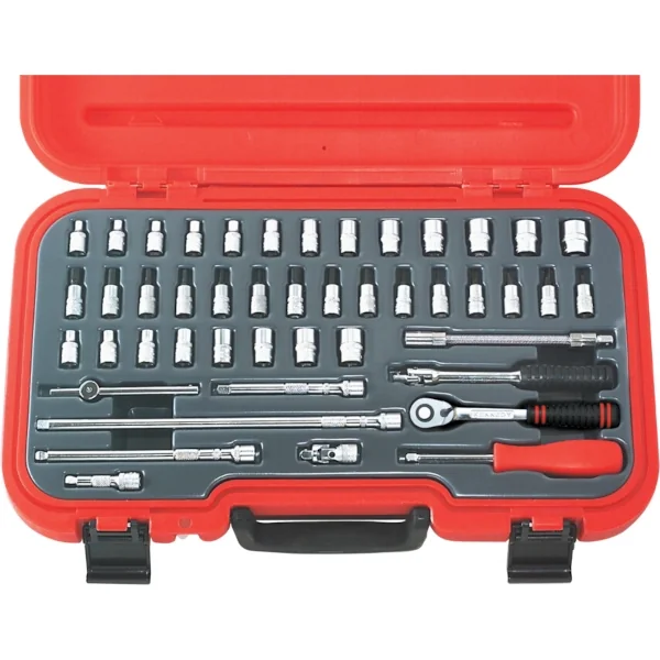 46-piece metric/AF imperial socket set ideal for mechanics, engineers and DIYers with 1/4-inch square drive, chrome vanadium steel with polished finish, supplied in plastic case for storage and transport