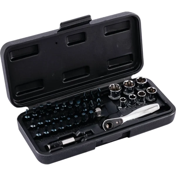 Hexagon socket 1/4 and 3/8 inch square drive chrome-plated polished size 6-22 mm Torx sockets and assorted screwdriver bits with extension bars, universal joint and reversible ratchet 46 pieces on soft foam insert Safety-Insert-System (SIS) in Plastic box