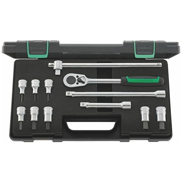 Set of hexagon screwdriver bit socket 1/2 inch square drive size 4-17 mm with ratchet handle T-slide handle and extension bars 12 pieces in ABS plastic case