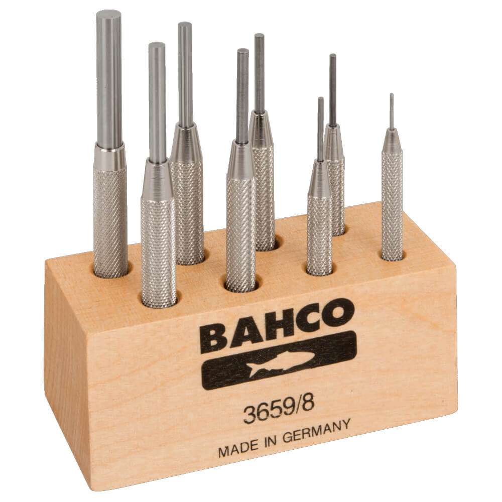 Set of Cylindrical drift punch made of high-performance alloy steel nickel finished, guide sliding sleeve with knurled 8 pieces size 0.9 – 5.9 mm in plastic stand