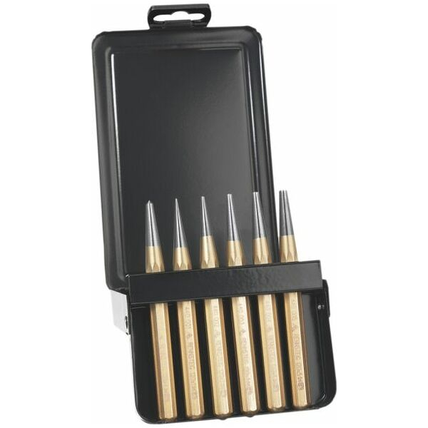 Center and taper pin punch set with hexagonal shank consisting of taper pin punch size 2/3/4/5/6 mm and center punch 6 pieces in a metal case