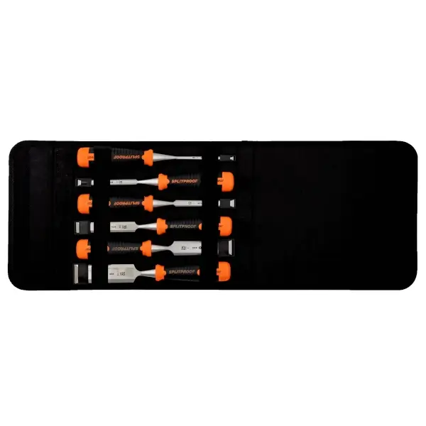 Set of Ergo woodworking chisel made of hardened and tempered high quality steel for long-lasting performance with polyamide Splitproof handle, 6 pieces size 6 / 10 / 12 / 18 / 25 / 32 mm in high quality polyester pouch