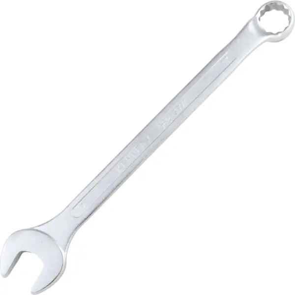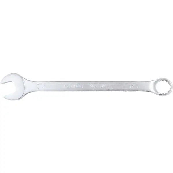 Combination wrench has an offset ring end, made from chrome vanadium stee, chrome-plated finish to protect against corrosion. It is 25% longer than conventional spanner wrenches, overall length 240 mm size 17 mm