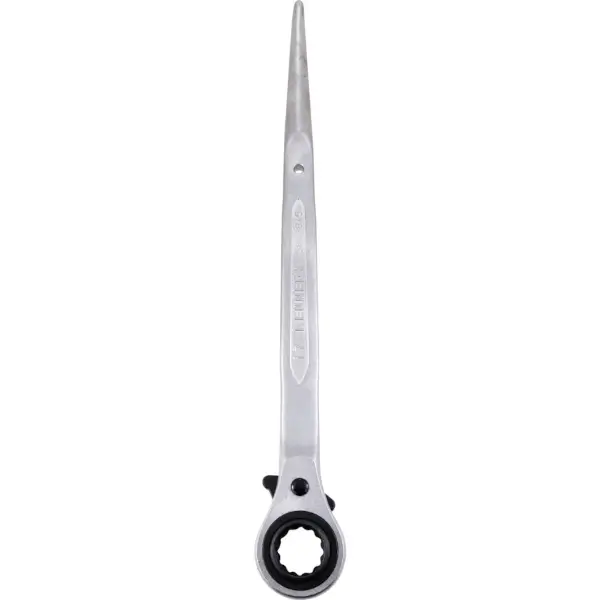 Podger spanner with reversible ratchet function made of chrome vanadium steel, suitable for heavy-duty construction applications and has tapered handles for erecting scaffolding and aligning steelwork sizes 17 x 19 mm
