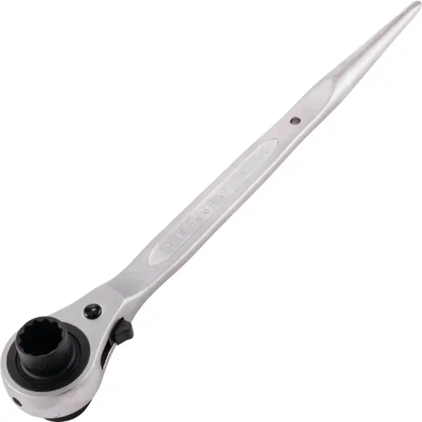 Podger spanner with reversible ratchet function made of chrome vanadium steel, suitable for heavy-duty construction applications and has tapered handles for erecting scaffolding and aligning steelwork sizes 19 x 24 mm