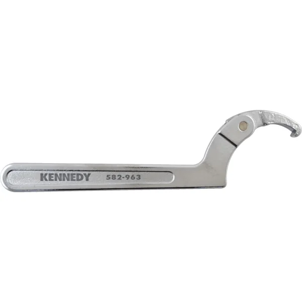 Adjustable C hook wrench for loosen and tighten fastenings, made of chrome vanadium steel with highly polished chrome plated finish, used on slotted rings and threaded collars, diameter range 4.1/2 to 6.1/4 inch