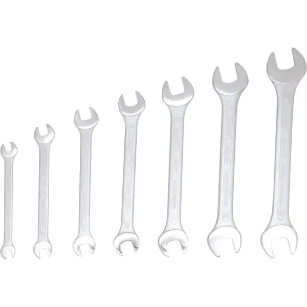 Set of double open-ended wrenches is ideal for general use. Made of chrome vanadium steel with satin chrome finish that makes them easy to clean, contains 7 pieces sizes 6 x 7, 8 x 9, 10 x 11, 12 x 13, 14 x 15, 16 x 17 and 18 x 19 mm