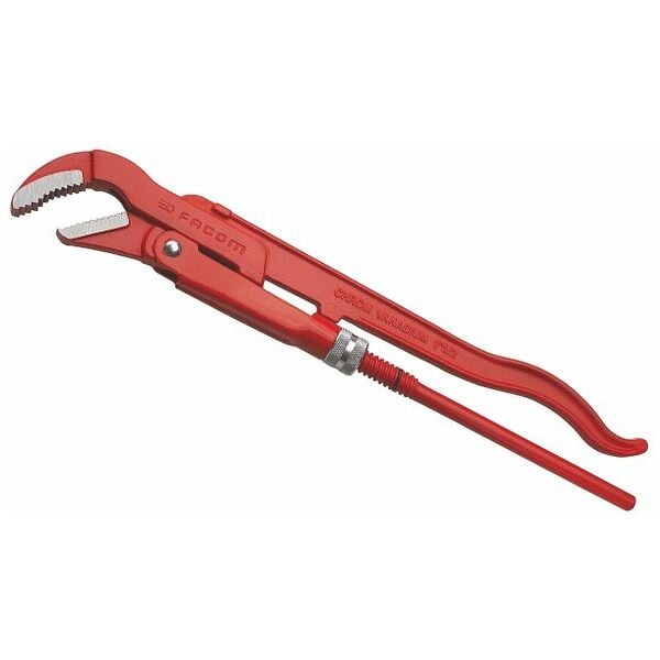 Swedish pipe wrench 90 degree angled slim head allows to accessibility in confined spaces made of high-alloy steel with induction hardened teeth Anti-rust treated overall length 426 mm size 1.1/2 inch