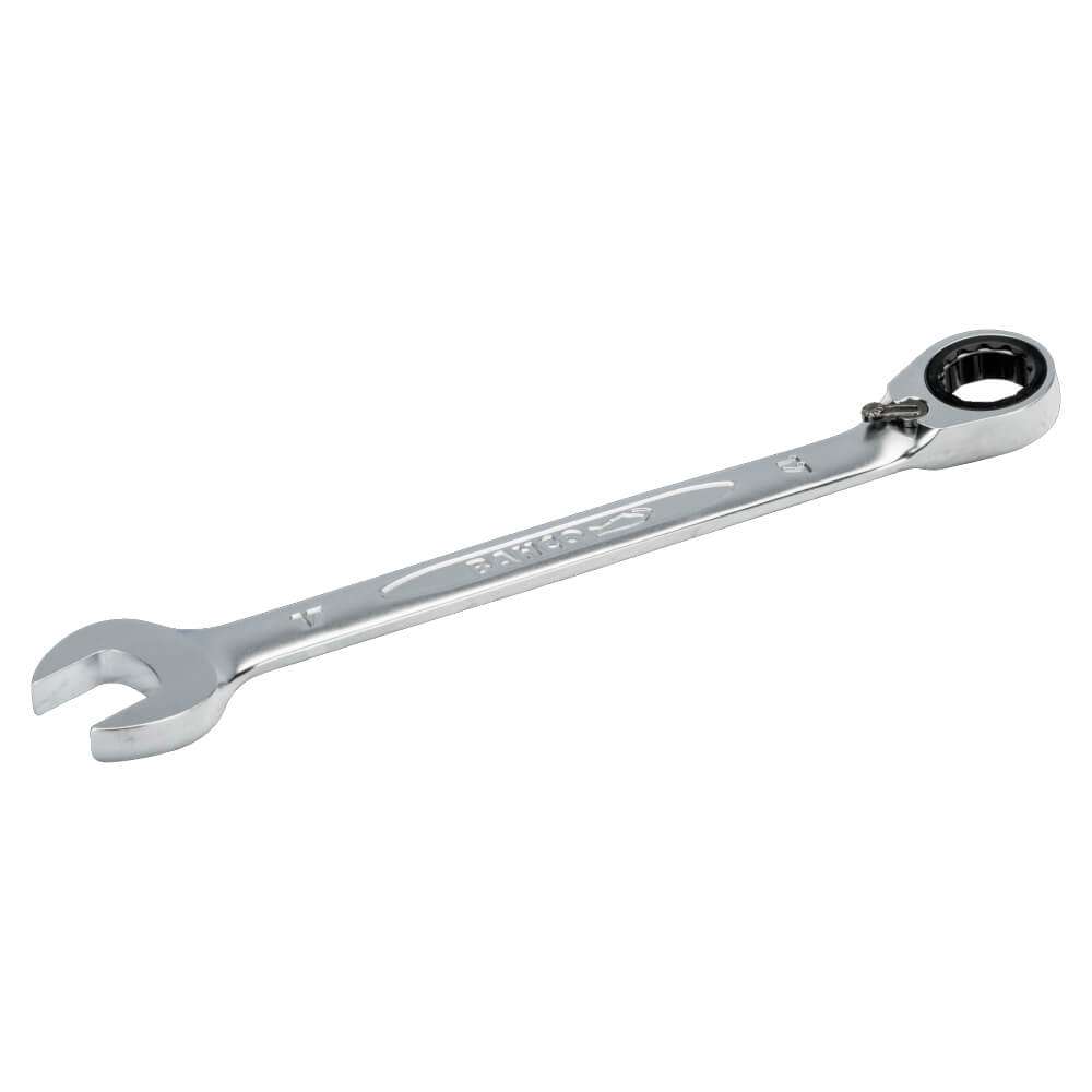 Combination wrench with reversible ratchet 72 teeth reversing by lever and rapid open-end made of high quality steel satin chrome finish length 247 mm size 19 mm