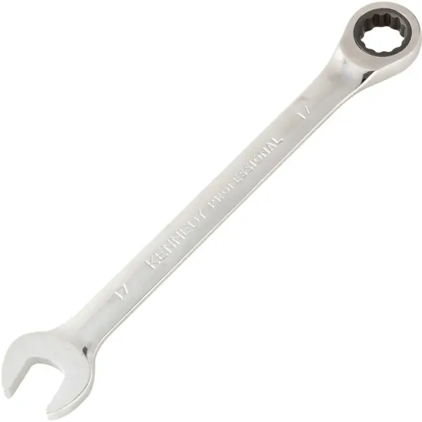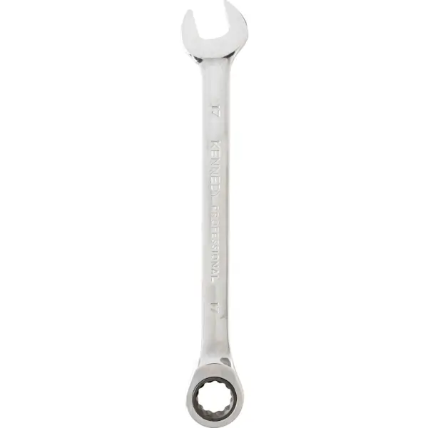 Combination ratchet wrench for professionals has a thin-wall design that allows greater access to hard-to-reach areas, made of chrome vanadium steel with mirror-polished finish, overall length 230 mm size 17 mm
