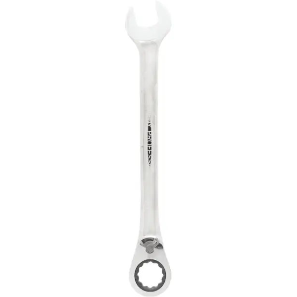 Combination ratchet wrench has a 15-degree offset ring and a reversible lever, ideal for professional use, made of chrome vanadium steel with a mirror-polished finish, overall length 325 mm size 24 mm