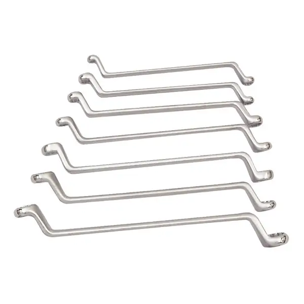 Set of offset ring wrench is suited to industrial use, made of chrome vanadium steel for optimum durability and product longevity, and has a satin finish, 7 pieces size 6×7, 8×9, 10×11, 12×13, 14×15, 16×17 and 18x19mm