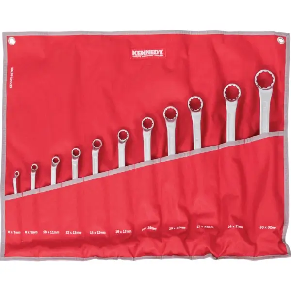 Set of offset ring wrench is suited to industrial use, made of chrome vanadium steel for optimum durability and product longevity, 11 pieces size 6×7, 8×9, 10×11, 12×13, 14×15, 16×17, 18×19, 20×22, 21×23, 24×27 and 30×32 mm