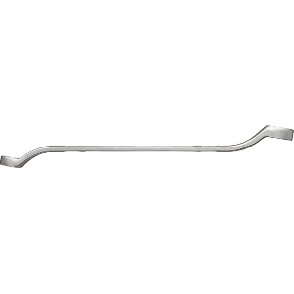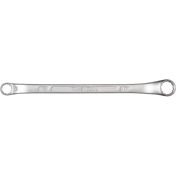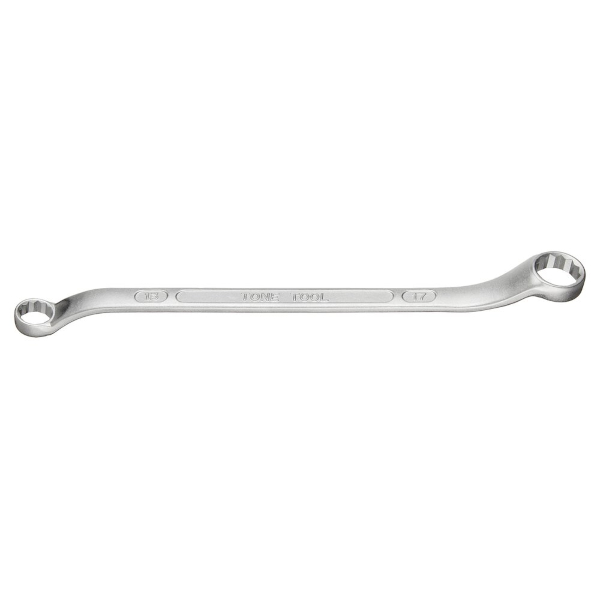 Long mechanic ring wrench offset 45 degree angle for avoiding surrounding obstacles made of structural steel mirror satin finish length 247 mm size 13 x 17 mm