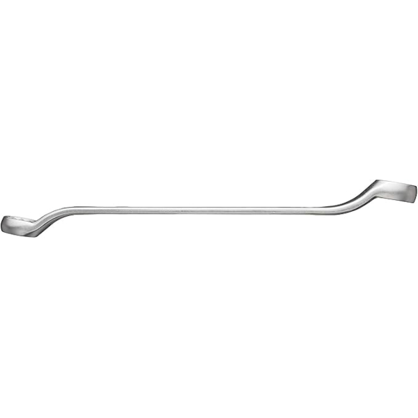 Long mechanic ring wrench offset 45 degree angle for avoiding surrounding obstacles made of structural steel mirror satin finish length 350 mm size 24 x 27 mm