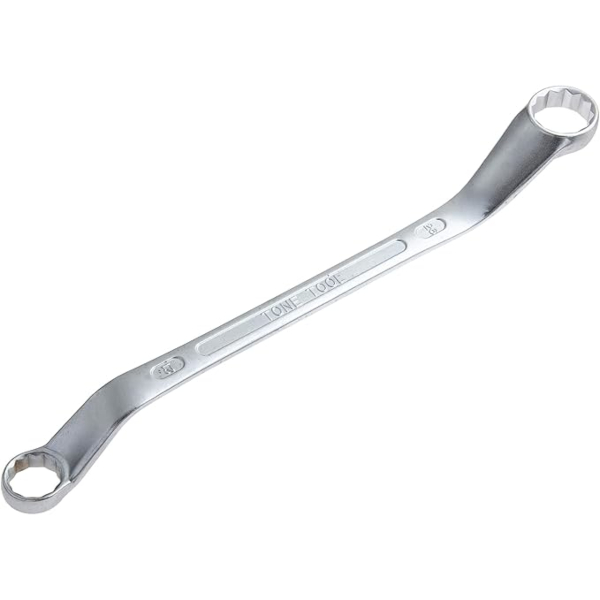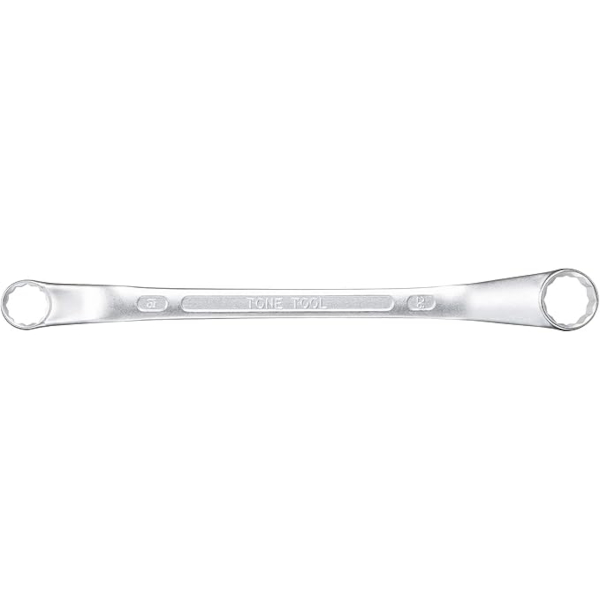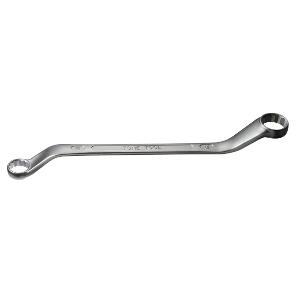 Long ring wrench offset 45 degree angle for avoiding surrounding obstacles made of structural steel mirror satin finish length 340 mm size 21 x 26 mm