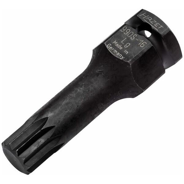Long impact XZN bit socket 1/2 inch square drive and 24 mm hexagon drive phosphatized with borehole for locking pin or safety spring and groove for O-ring overall length 75 mm size M16