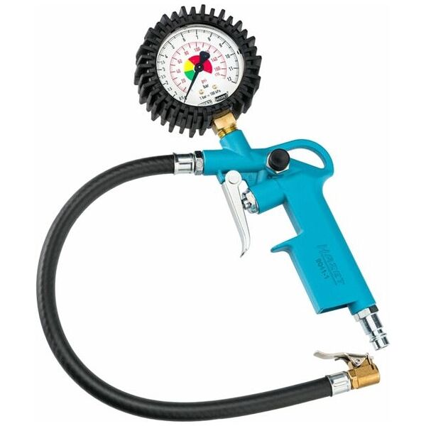 Tyre inflator with special rubber housing protects manometer against light impacts flexible hose length 400 mm with plug-in nipple max pressure 12 bar tolerance 0.3 bar