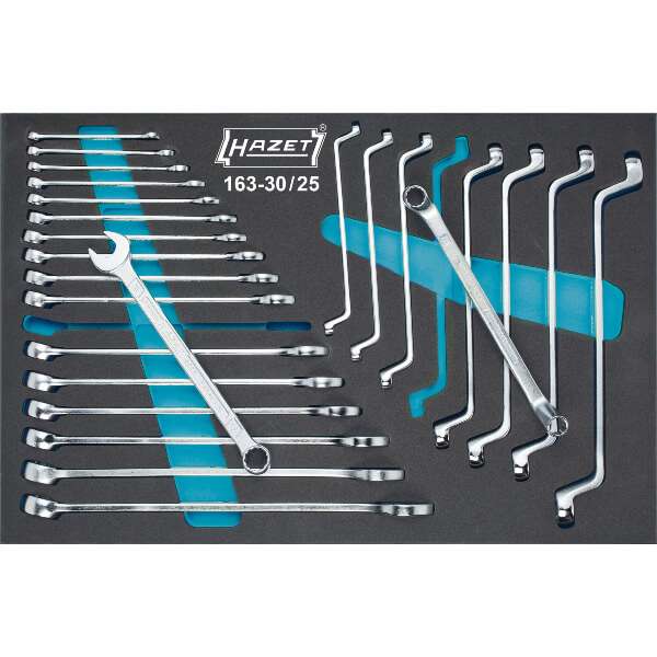 Set of combination wrenches size 6-24 mm and double box-end wrenches size 6×7 – 21×22 mm 25 pieces on Safety-Insert-System (SIS) size 519 x 342 mm