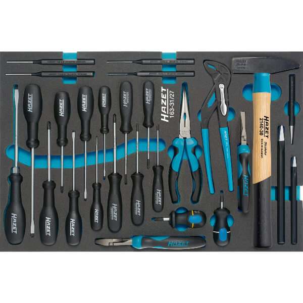 Tool set with assorted screwdrivers, pliers, hammer, chisels and drift pins 27 pieces on Safety-Insert-System (SIS) size 519 x 342 mm
